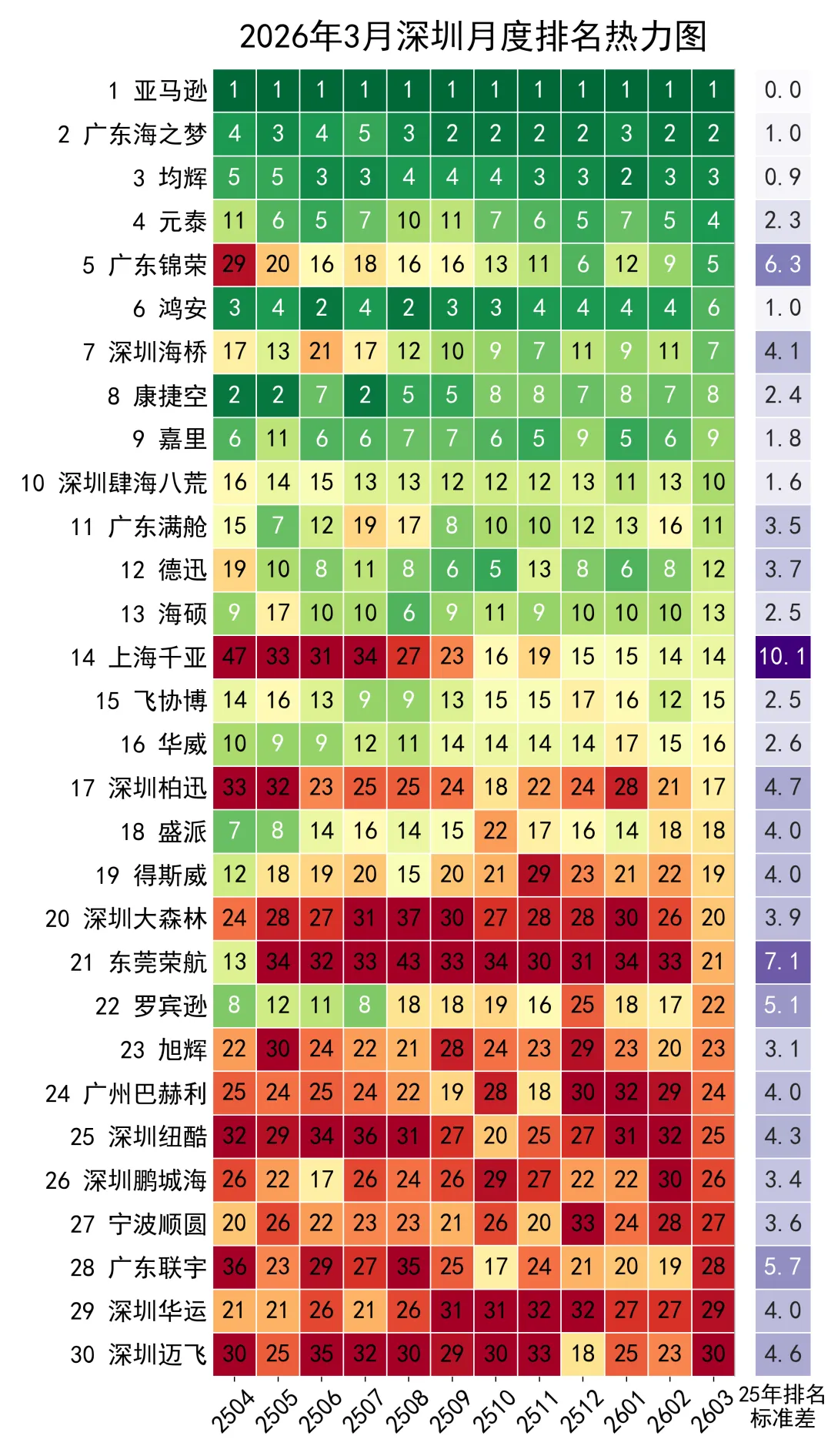 热力图解读:热力方块越绿排名越靠前,越红则越靠后;灰色为排名在100名以外,白色为前期无数据。新增标准差列,标准差越小,排名越稳定。