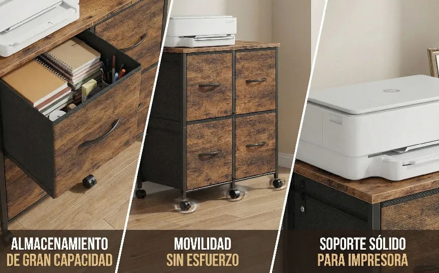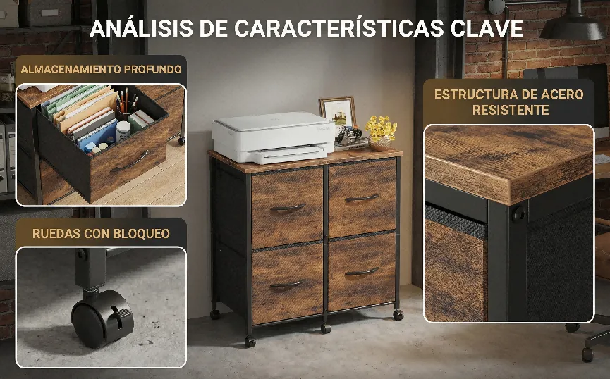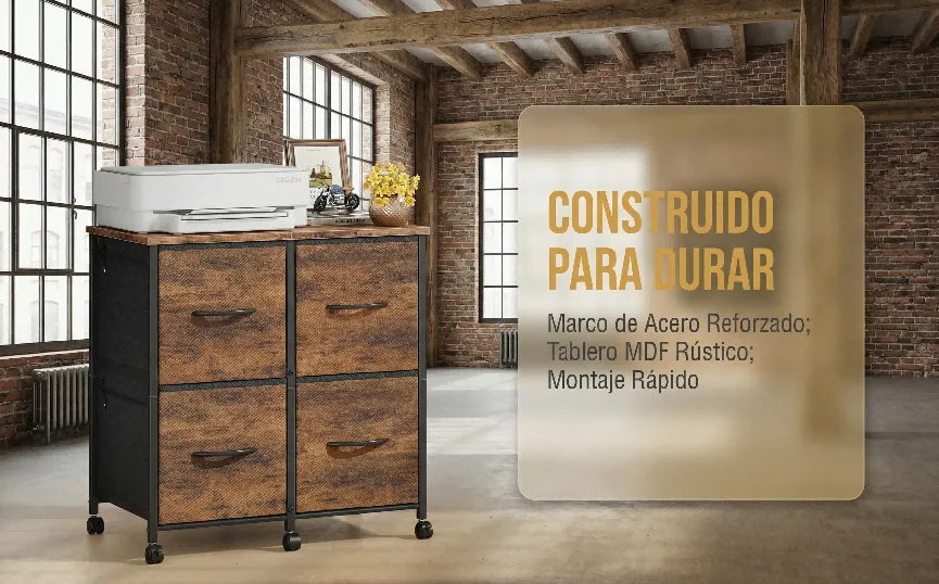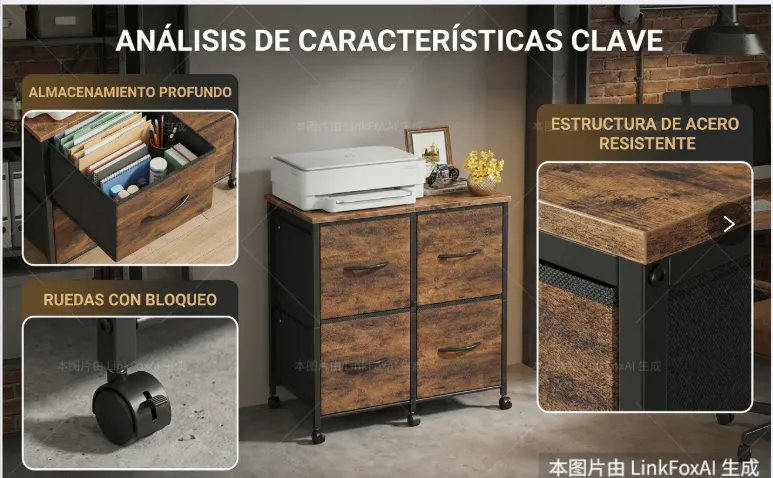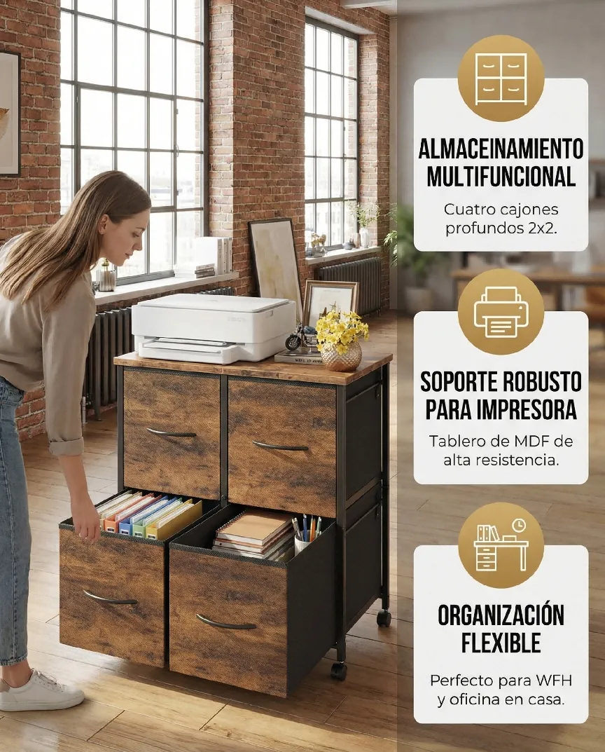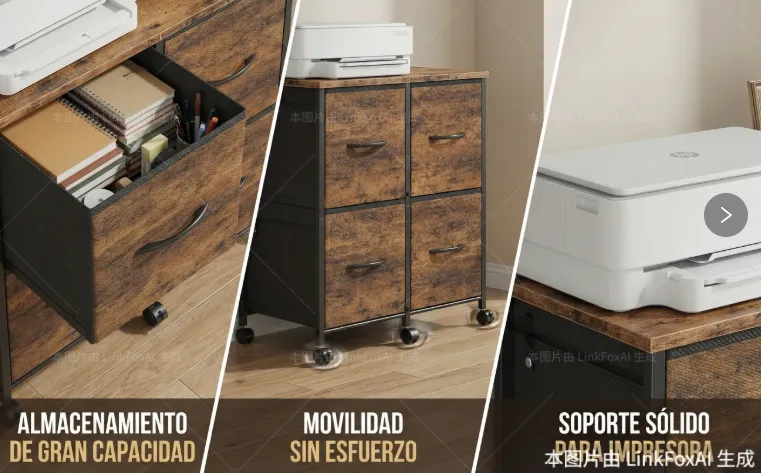 [卖点描述]:【多功能存储】采用2x2布局的四个深层抽屉,提供充足的Storage空间,可用于收纳文件、办公用品、衣物或玩具;【打印机支架功能】坚固耐用的MDF桌面,承重能力强,可完美放置打印机、扫描仪或装饰品;【灵活移动】底部配备4个Smooth-Rolling Casters (万向轮),其中2个带有Locking Brakes,方便在办公区域内移动和固定。