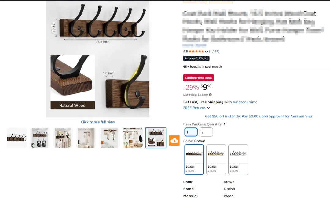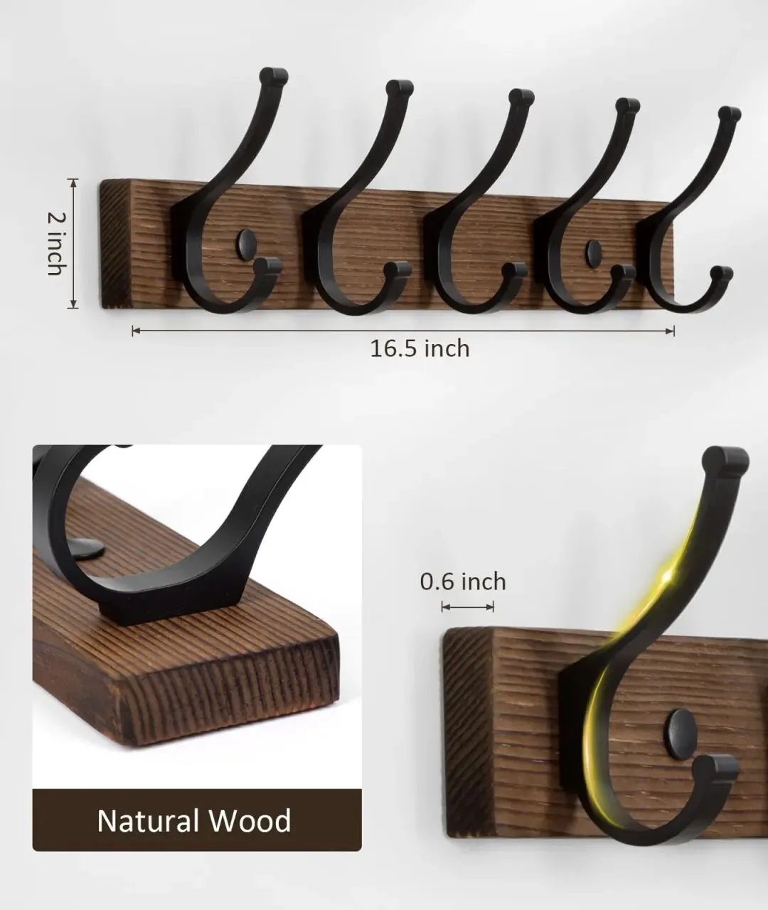 解析: 这是严格遵守亚马逊主图规则的标准首图。采用左前侧45度俯视视角 (Isometric angle),能够完美展示挂钩的正面弧度、侧面厚度以及底板的木纹长度。产品占据画面约 80% 的比例。光源为均匀的摄影棚平光,消除死黑阴影,突出金属烤漆和木材的物理质感。