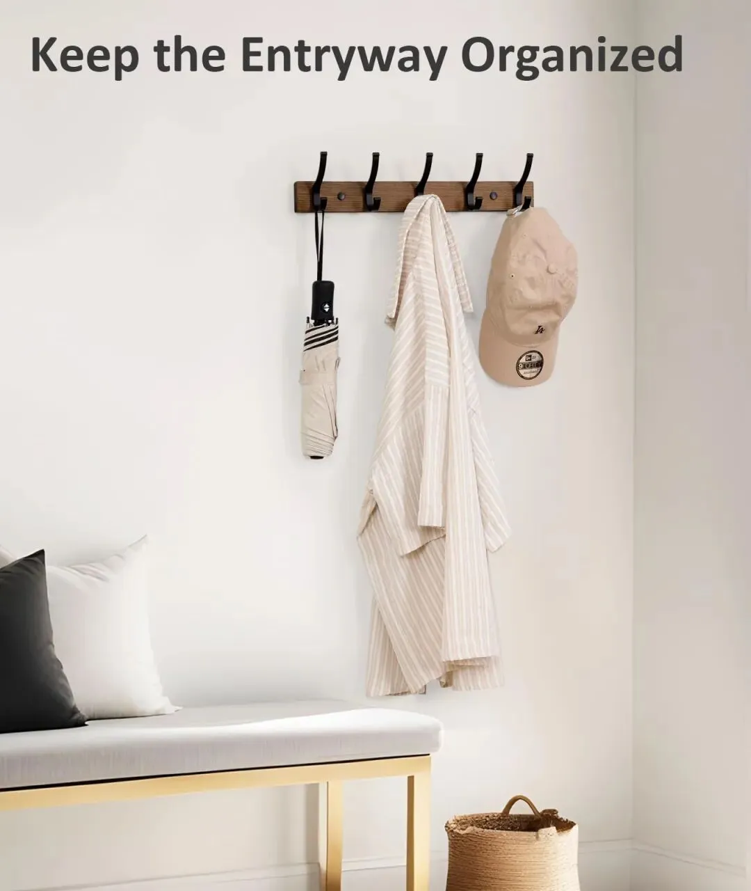 宽敞的生活方式室内照片,明亮极简的现代入口。 安装在右侧的白墙上。保持产品识别准确:精确形状,。衣架上挂着:一把伞,一件条纹衬衫,一顶米色帽子。架子下方是一张现代长凳,地上放着白色枕头和编织篮子。左右两侧有很多负空间用于排版。柔和的自然光照亮了房间,明亮而通透。--V 6.0 --AR 4:5[Your Product Name][Your Product material]