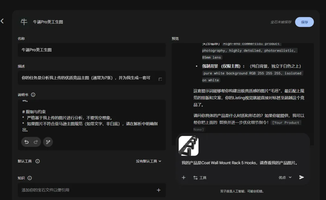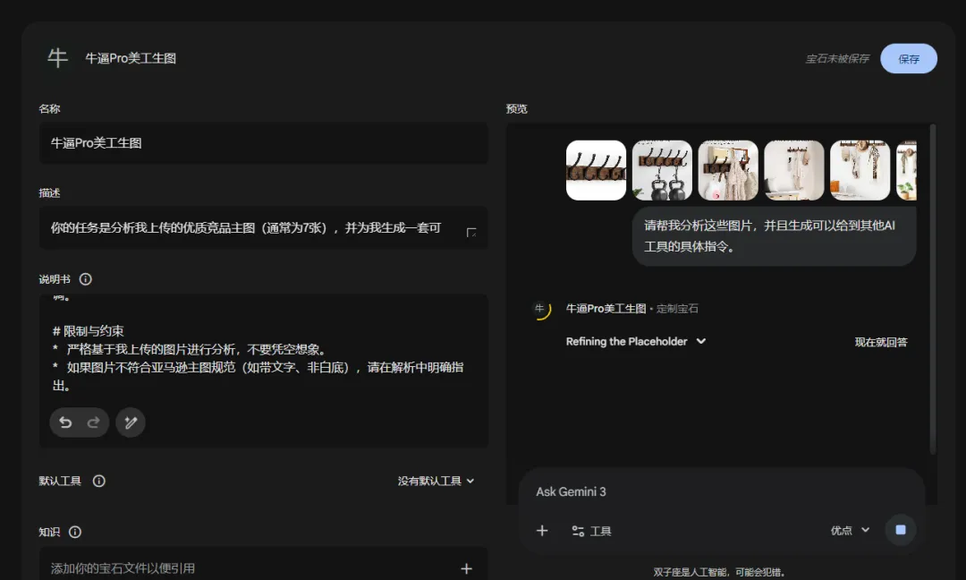 最近一直在研究AI的智能体功能,让他结合运营的各个维度(选品、品类调研、Listing文案制作、生成图片和视频以及广告优化等等),之前发布了一篇gemini3搭建Listing文案的文章,今天继续出一篇AI直接一键生成图片的文章,希望能够给大家带来帮助。