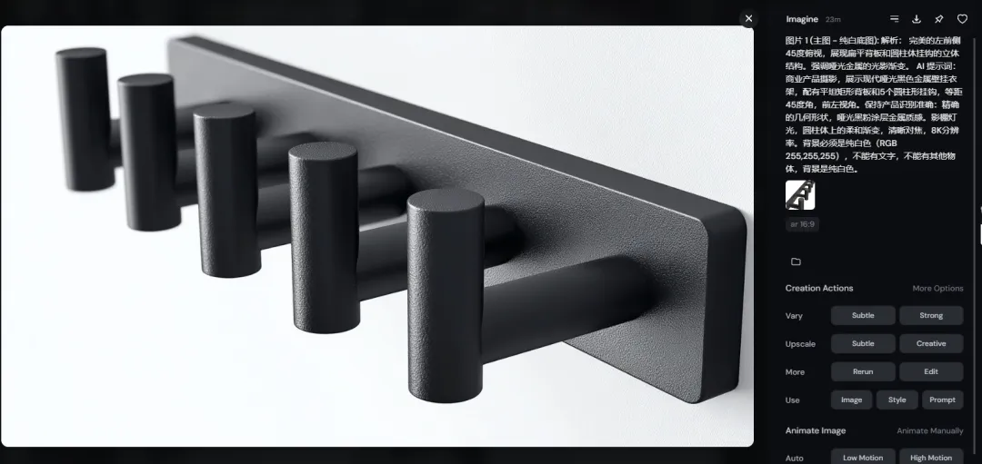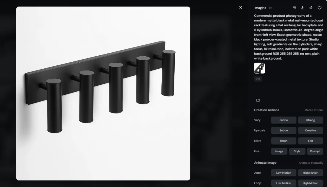 Commercial product photography of a modern matte black metal wall-mounted coat rack featuring a flat rectangular backplate and 5 cylindrical hooks, isometric 45-degree angle front-left view. Exact geometric shape, matte black powder-coated metal texture. Studio lighting, soft gradients on the cylinders, sharp focus, 8k resolution, isolated on pure white background RGB 255 255 255, no text, plain white background. --ar 1:1 --v 6.0 (大家可以直接让Gemini修改,我这里只是列举第一个修改的例子。)