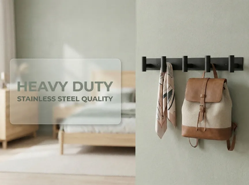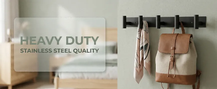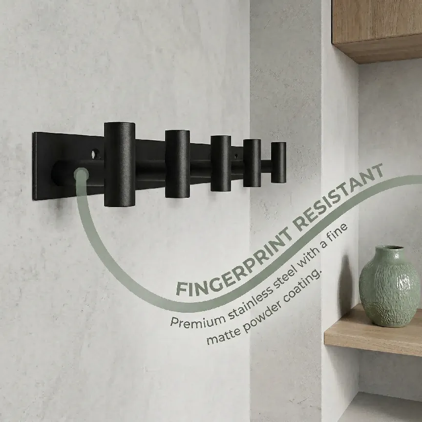 [材质描述]:优质 Stainless Steel 材质,表面经哑光黑色粉末喷涂工艺处理,触感细腻且不易留下指纹;挂钩边缘圆润打磨,防止刮伤织物;底座预留两个精密钻孔,确保安装后的平整度与稳固性