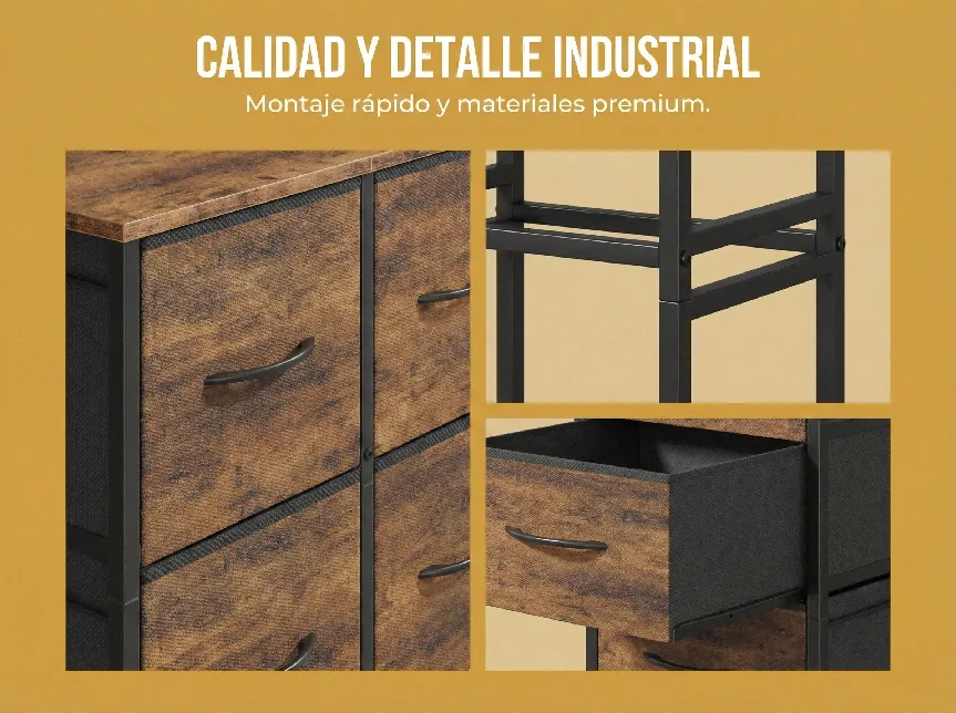 [材质描述]:主体结构为高强度黑色Powder-Coated Steel Frame,抗锈耐用;顶部台面为复古橡木色(Rustic Brown)高密度MDF板,纹理清晰;抽屉为耐磨损的织物布艺,表面印有精致的仿旧木纹理;配有哑光黑弧形金属拉手,增强了工业风格。