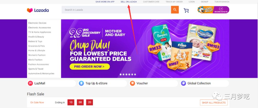 1.登陆Lazada 官网www.lazada.com.my,在官网上方点击“sell on lazada”。