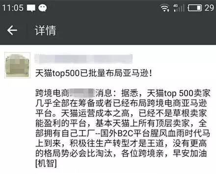 上周,有跨境电商公众号发文称,得到独家消息,天猫Top 500卖家正在赶往亚马逊的路上,有的已经布局亚马逊平台开始做跨境电商,由于这部分天猫顶层大卖家基本都拥有自己的工厂,他们的进入,势必会让竞争越来越激烈,利润越来越透明。