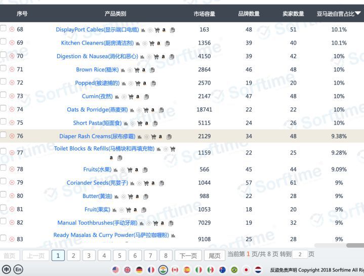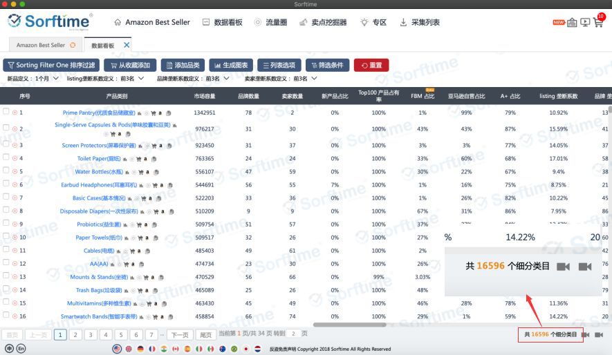 上面两张图来自Sorftime数据看板,分别列出了亚马逊美国站和印度站所有底层类目,从图表右下方可以看到,美国站一共有16596个细分类目,而印度站只有3858个细分类目。