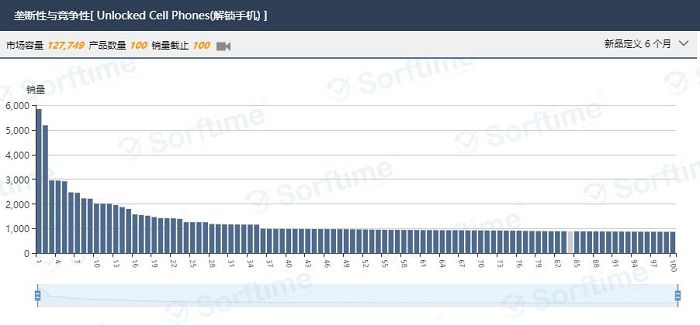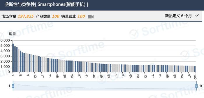 上面两张图都是智能手机TOP100市场listing分布柱状图,图一反应了美国市场该类目销售情况,图二反应了印度市场该类目销售分布,当我们在两张图右上方定义新品为6个月时,此时图中灰色柱状图代表新品,图一美国站灰色柱状图少新品少,图二灰色柱状图多代表新品多。