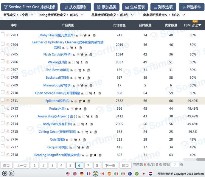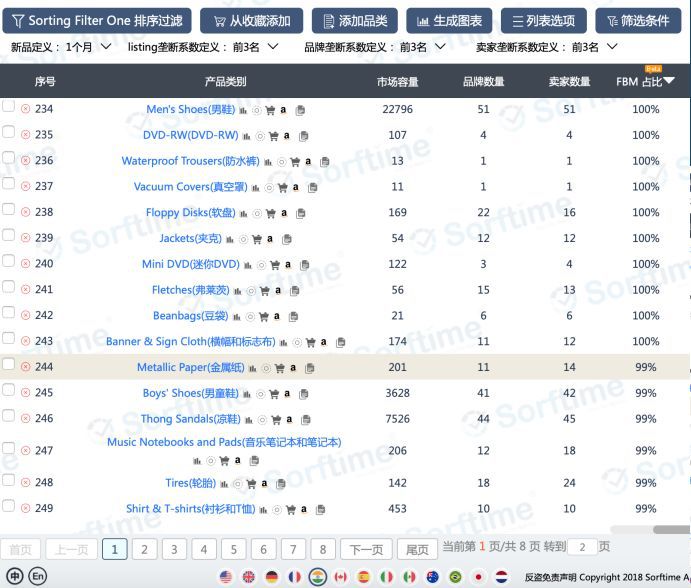 在Sorftime数据看板中选中亚马逊印度站所有品类,按照FBM这一维度进行降序排列,图一中发现在排名244的类目之前,FBM占比100%,图二发现,在排名2711的类目之后,FBM占比低于50%。