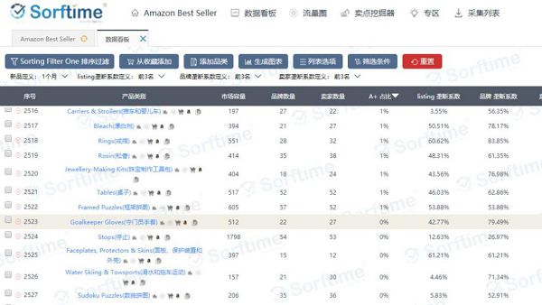 在Sorftime数据看板中对亚马逊印度站所有品类,按照A+这一维度进行降序排列,可以看到从排名2523类目以后,A+占比都为0。
