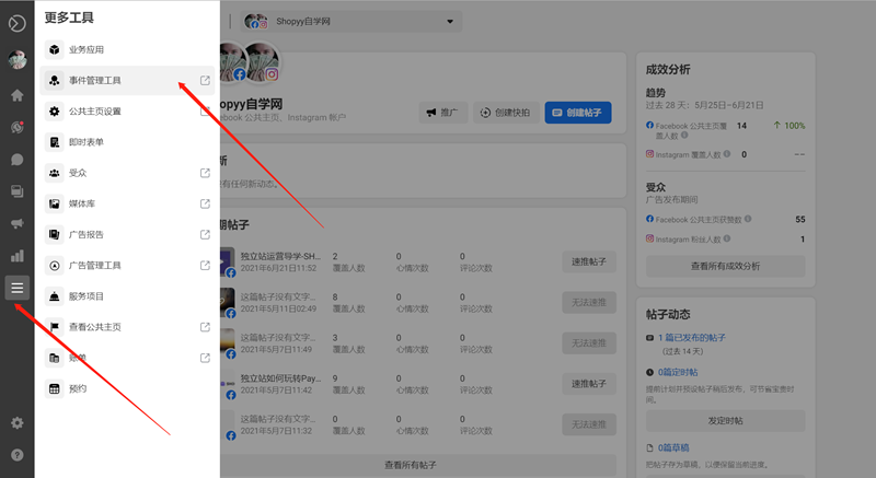 如果在这里没有找到事件的管理工具也没关系,可以先点击其他选项,左上角还是能够跳到事件管理工具的。