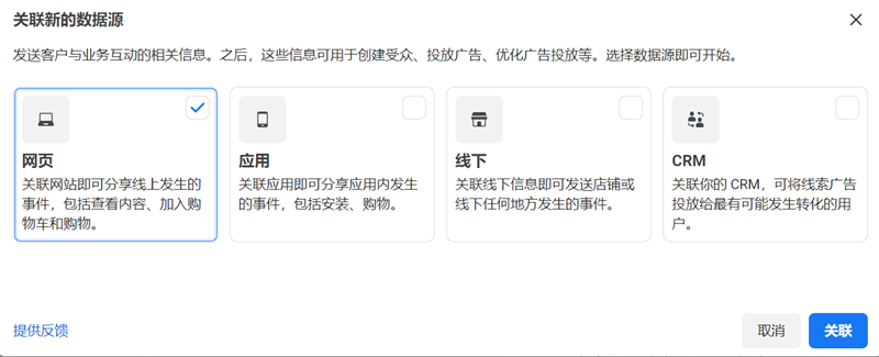 2、找到对应广告账户,选择关联的数据源,并选择网页