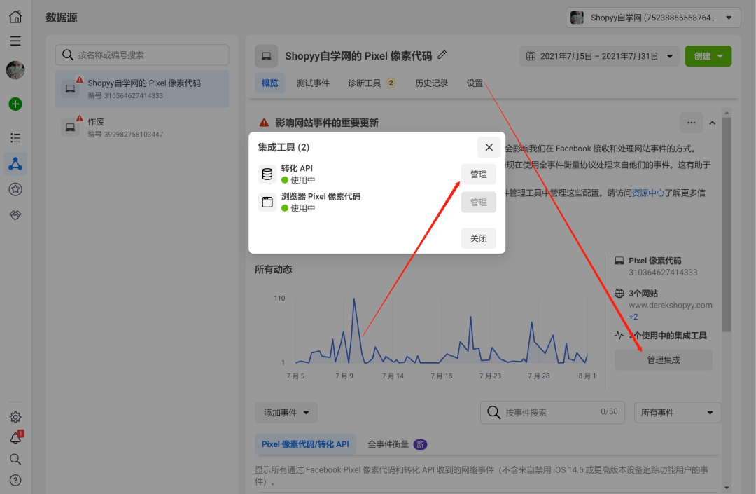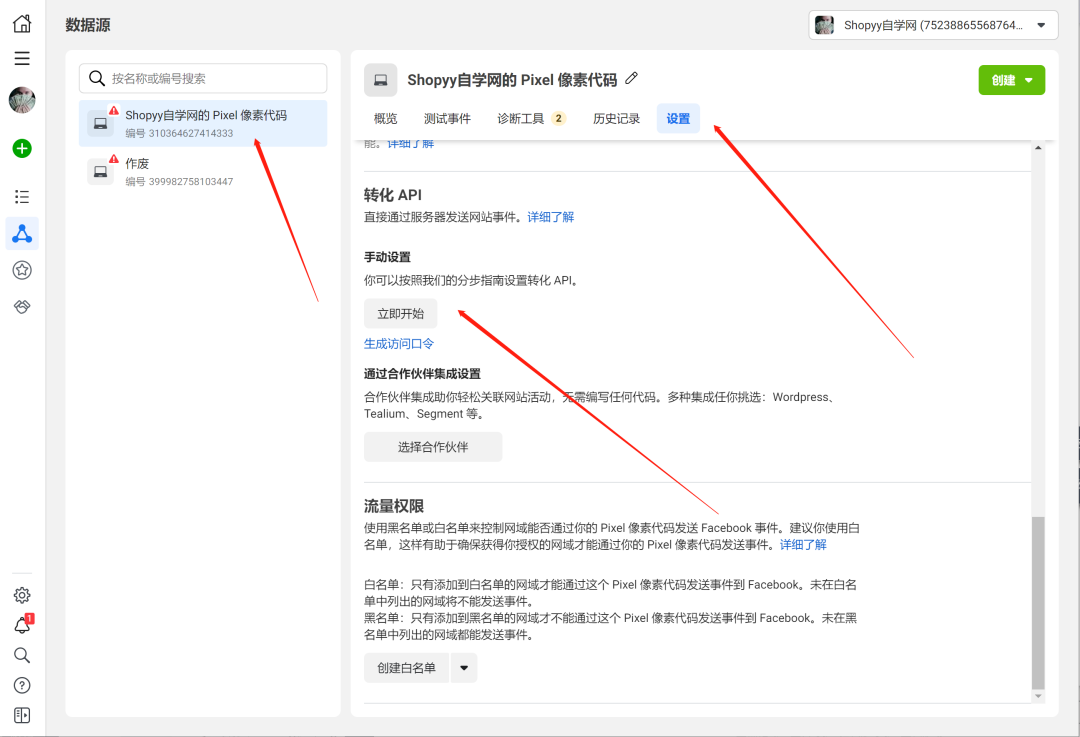 事件管理中心,数据源,找到原先的像素,在设置下拉有个转化API,点击立即开启。