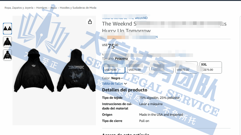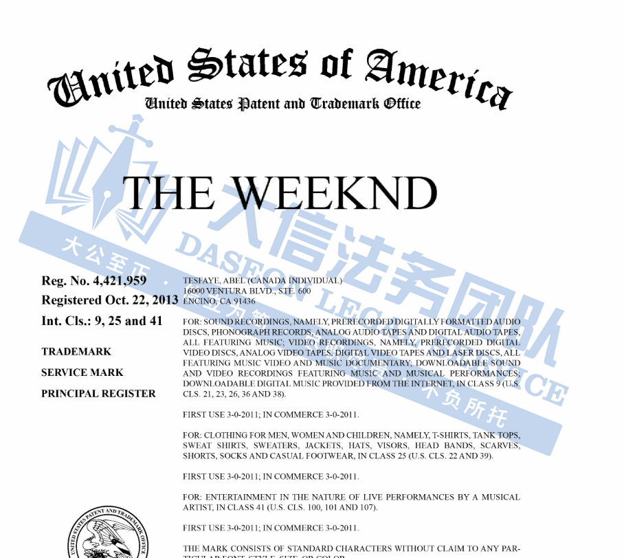 此案为商标维权,涉及一个商标,商标词:The Weeknd,商标号为:4421959,涵盖025服装、041娱乐服务以及009录音制品等品类,目前至少有百家店被波及,以下是涉及商标的具体信息,未经授权不得擅自使用,侵权风险极高!跨境卖家尽快检索下架,避免造成TRO侵权损失!