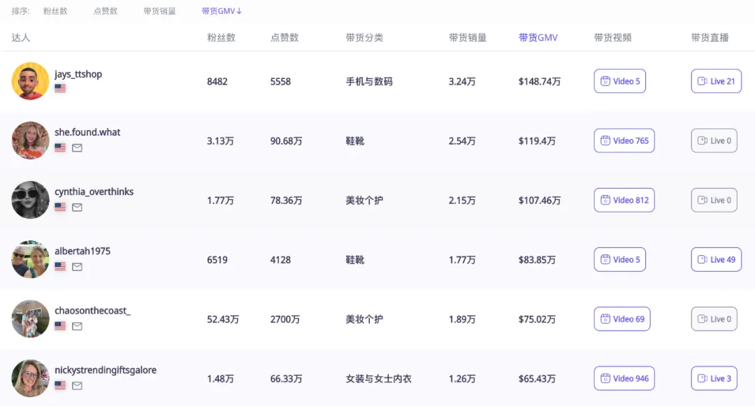根据EchoTik数据,Crocs的带货达人的类型覆盖多个年龄层的群体。令人惊讶的是带货GMV最高的反而是粉丝不足1万的尾部达人。@jays_ttshop为Crocs录制了5个带货视频,并展开了21场带货直播,带货GMV接近150万美元。