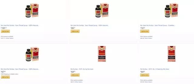 据在亚马逊网站搜索发现,一瓶300毫升的川贝枇杷膏售价从约10美元(约63元)起跳,最高标价达到近65美元(约400元)。