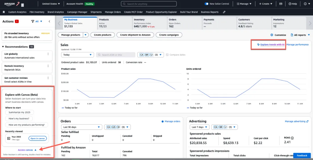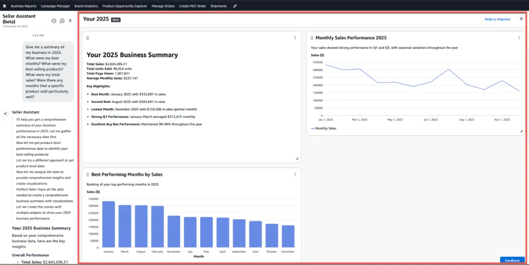 Seller Assistant AI以前的作用,主要是解读政策和指路到对应的报表或帮助页面。有了Canvas的结合,它开始真正做一件事:分析你的实际经营数据。这是一条AI赋能的关键分水岭。