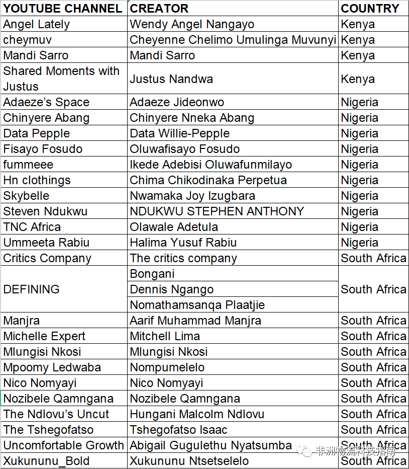对于想在非洲做上线推广的APP运营者,独立站玩家都想找到符合自己品牌调性的网红做合作,小编我在网上无意中看见Youtube选出的26名非洲本土自媒体频道名单,分享给大家,希望关注我们公众号的读者都能够找到自己的想合作的非洲李子柒。