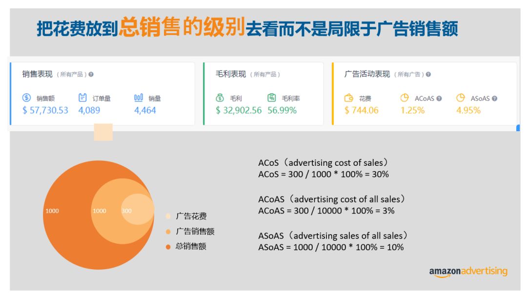 年度直播中三位专业卖家分享了淡旺季营销、父子变体广告、以及淡旺季广告指标等重磅内容。淡旺季广告指标的分享中,职业广告优化师西西提到,正确评估广告效果,应该“把花费放到总销售的级别去看,而不是局限于广告销售额”,并介绍了ACoAS与ASoAS两个概念。
