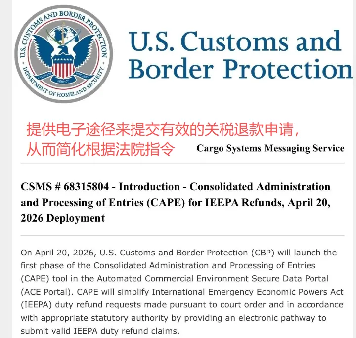 为了承接海量的退款申请,CBP专门开发了CAPE(统一报关管理与处理系统),嵌入现有ACE门户,替代了传统逐票申报的模式,实现批量处理、合并退款。