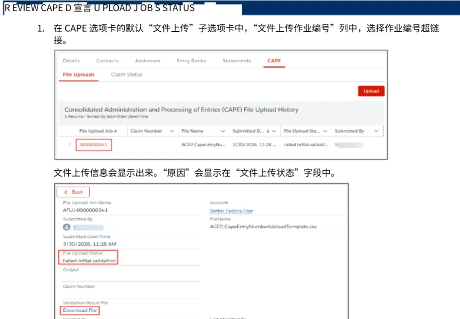 最后一个环节,通过校验的申报,申请人可以在CAPE板块的索赔状态子页,查看审核进度,下载每条报关单的处理结果。