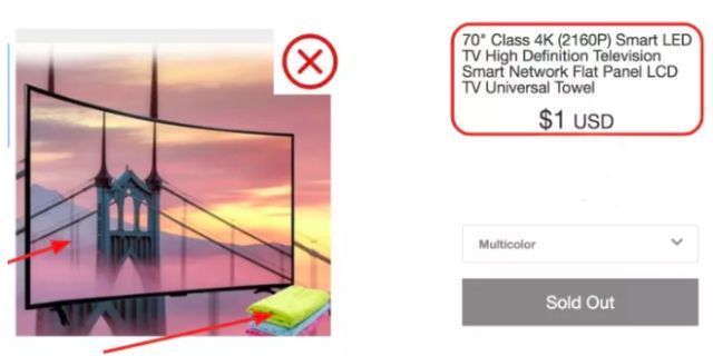 违规原因:标题和图片的重点在电视机上,但实际售卖的产品是毛巾。这样的编辑行为会给用户造成“电视机极其低价”的假象。