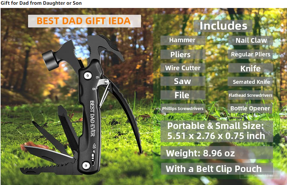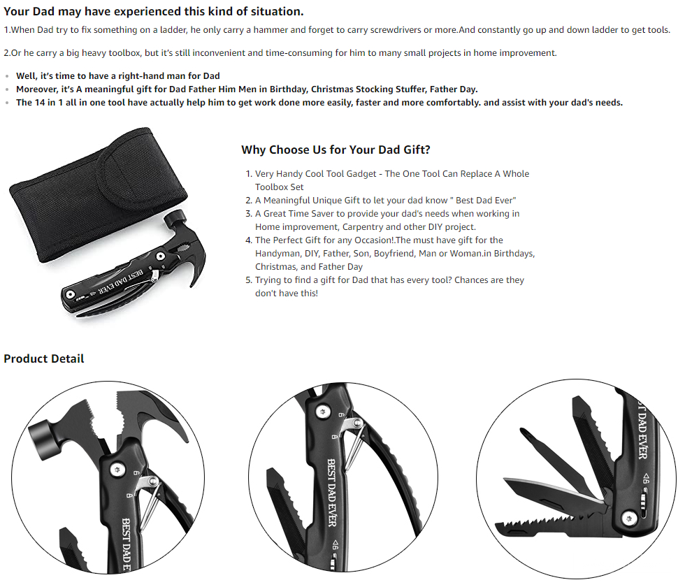 从标题埋词:Gifts for Dad from Daughter Son, Unique Gift、Cool等, 颜色:Best Dad Ever,最好的爸爸 卖点阐述「给爸爸的最好的礼物」、「爸爸需要的一切」 A+ 层层递进,步步攻略,情感打动消费者 「 给爸爸的最好的礼物」