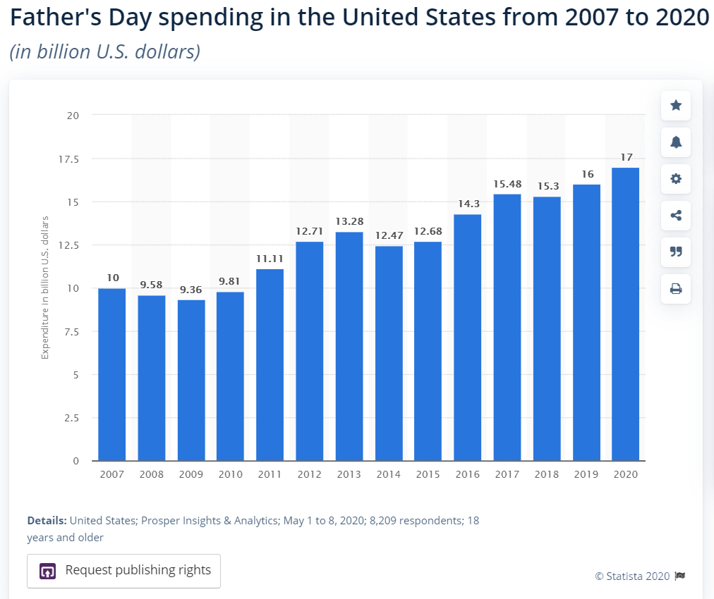 2019 年美国父亲节的支出为 160 亿美元,创历史新高,比 2018 年的 153 亿美元增长了 4.5%。Statista 预计在 2020 年的父亲节消费支出将继续增长,达 170 亿美元。