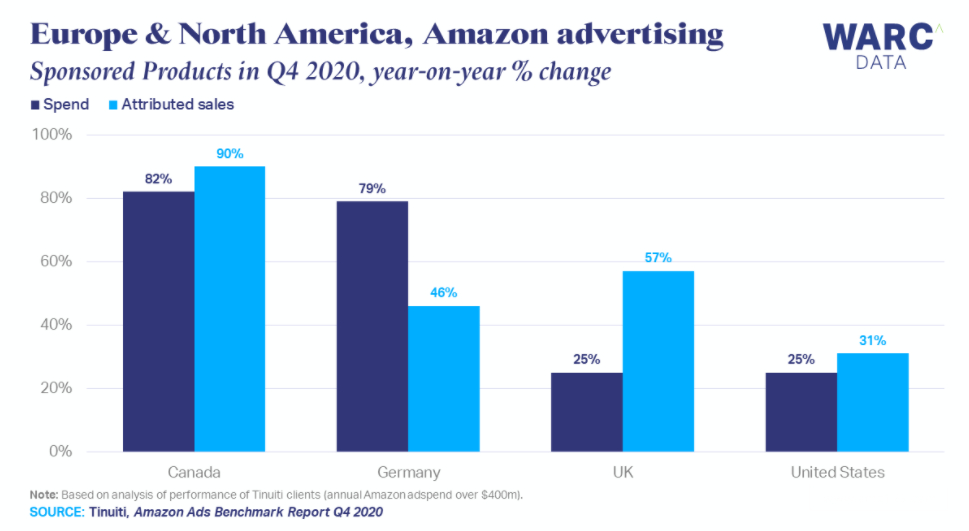 数据显示,在2020年第四季度,亚马逊加拿大、德国、英国和美国四个站点的卖家在赞助产品广告(基于关键词的广告出现在搜索结果中)上的支出平均增长了53%,由此产生销售额平均增长了56%。