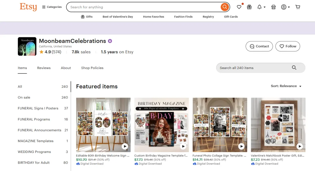 除了核心的殡葬纪念模板,店铺也搭配了生日、情人节等场景的轻量数字模板作为补充,所有模板均支持Canva编辑,普通人无需专业设计技能,改文字、换照片就能直接打印使用,兼顾了情感需求与实用性。