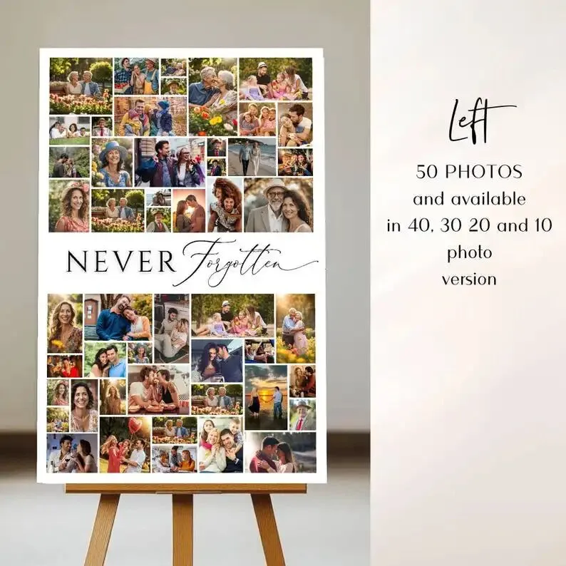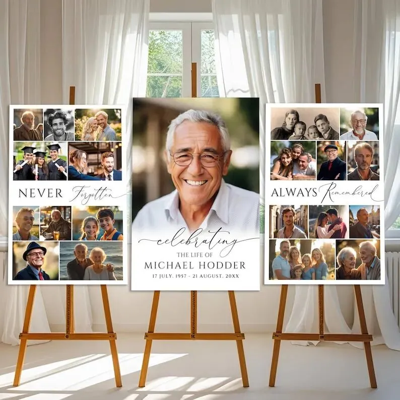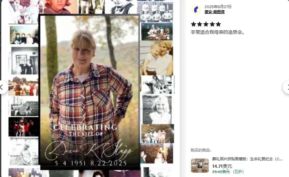 店里的核心爆品的是追悼会照片拼贴模板(折后14.71美元),没有肃穆的黑白色调,反而用柔和的配色、简约的版式,主打“以纪念替代哀悼”,帮用户留存逝者生前的美好瞬间,适配葬礼现场布置、家庭纪念册制作等多个场景。