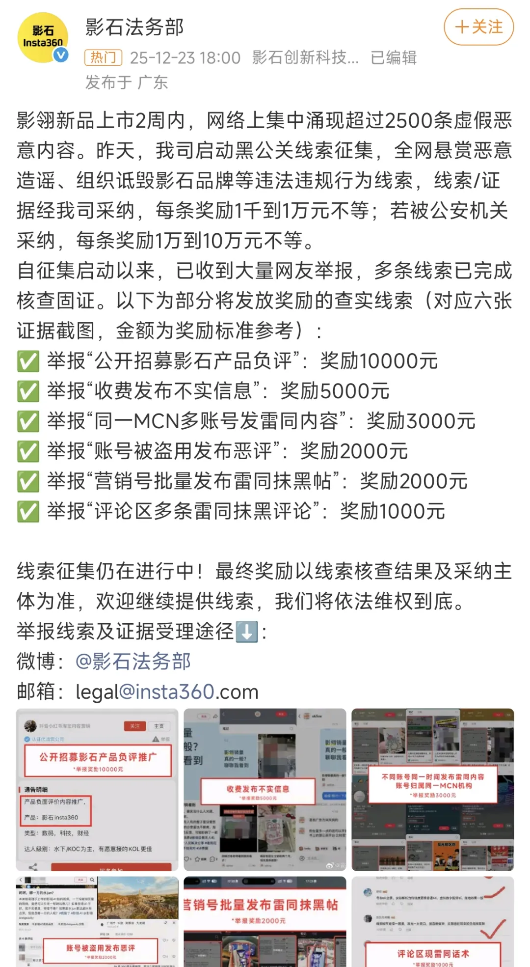 12月22日,影石启动线索悬赏机制,明确奖励标准:公司采纳线索奖励1000至1万元,公安采纳为关键证据则奖励1万至10万元。随后,影石公开证据显示,某众包平台以“品牌种草”为名招募写手发布负面内容,单条稿费最高2000元。