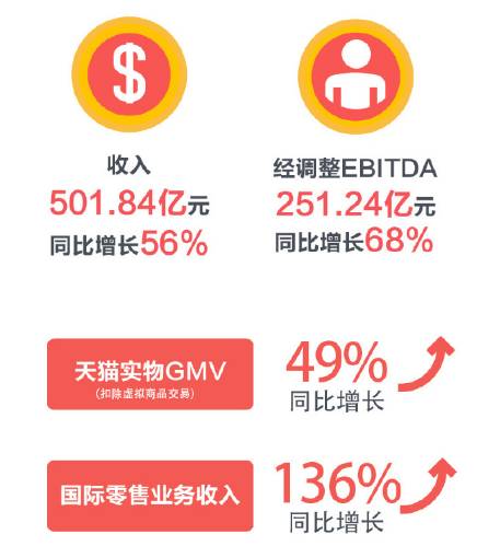 核心电商业务依旧表现强劲,Q1带来了430.27亿元人民币的收入,同比增长近一年里首次超过50%,也超过了营收增幅,达58%。天猫实物商品GMV同比增长49%,同比增长49%,移动月度活跃用户达5.29亿。