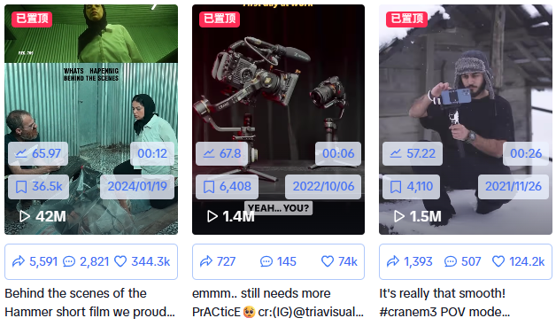 在 TikTok,智云官方账号 @zhiyun_global 用 403.8k 粉丝、190 万获赞的成绩,证明了 “垂直内容” 的爆发力。账号不做硬广,而是聚焦 “影像创作全流程”:发布《Hammer》短片、Synco 品牌 TVC 的幕后花絮,让用户直观看到 CRANE 系列如何解决 “动态跟焦”“复杂运镜防抖”;展示 CRANE M3 用 POV 模式拍雪景的视频,单条获 124.2K 点赞;用 Molus X100 RGB 补光灯打造 “花朵生长” 光影特效,勾起用户的创作兴趣。