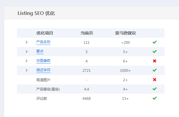 如果不知道listing有没符合亚马逊规则,可使用紫鸟“产品分析”功能(免费),具体告诉你listing页面需要继续优化的点在哪。下图打“X”的项目需要优化。