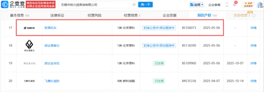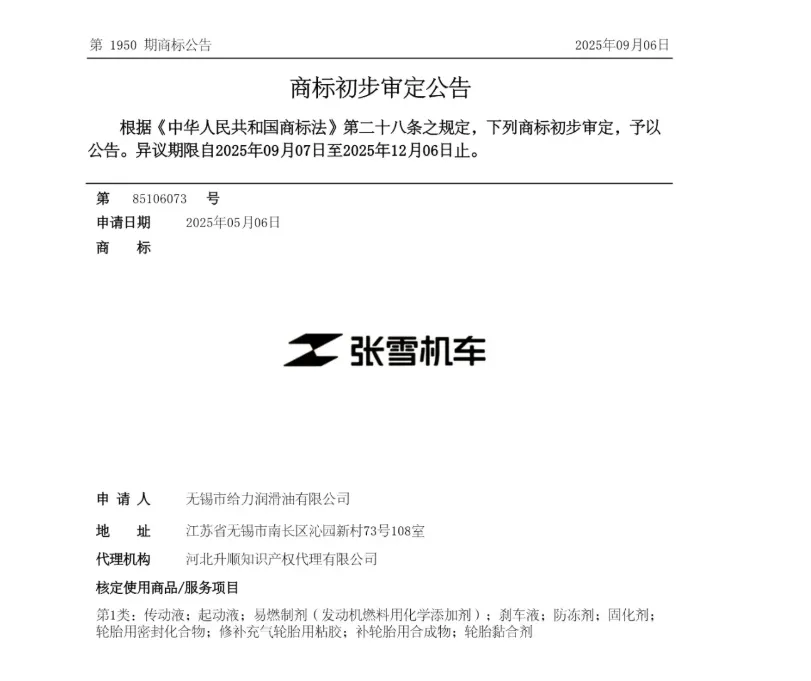 据报道,一家名为润滑油有限公司的企业于2025年5月6日申请注册“张雪机车”商标,类别为“化学原料”,目前该申请正处于等待实质审查阶段。同年,该企业还提交了 “凯越机车” 商标的注册申请,同样归属化学原料类别,且现已注册成功。