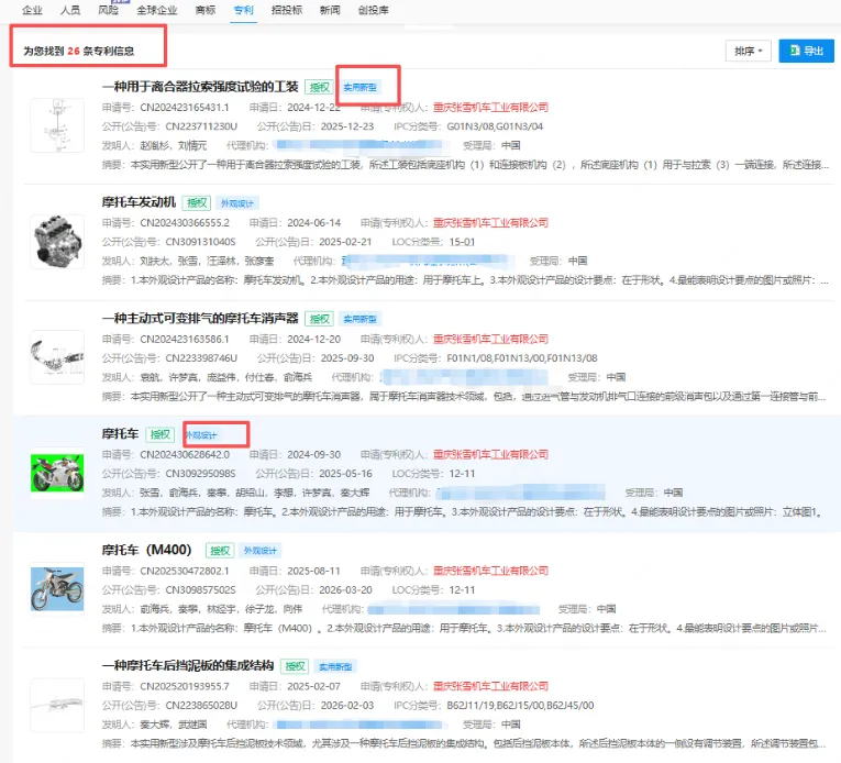 不仅仅商标,据查询,重庆张雪机车工业有限公司拥有26项技术专利,涵盖发明、实用新型和外观设计三大类型,为机车的创造发展保驾护航。