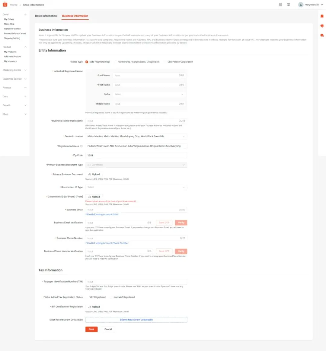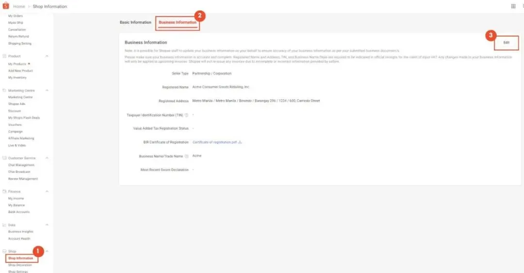 2024 年 3 月 28 日或之后注册的卖家在注册时提供的税务信息将直接出现在业务信息页面