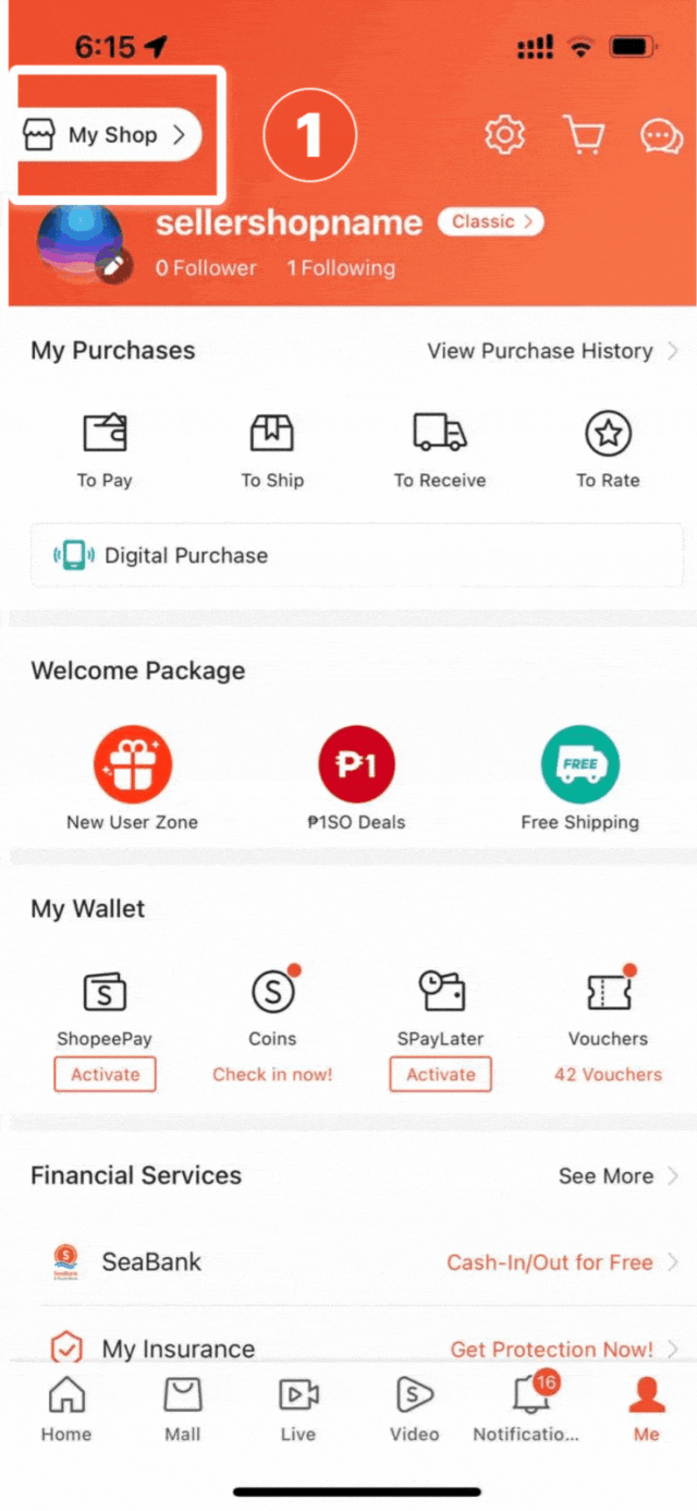 在Shopee应用程序上: 1. 前往我 > 我的商店