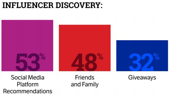 如下图所示,53%的受访者表示他们通过社交媒体找到了新的网红,但朋友和家人(48%)也是他们了解新内容创造者并关注的一种流行方式。32%的受访者表示,他们曾通过竞赛或关注送礼物活动发现到一位新的网红。