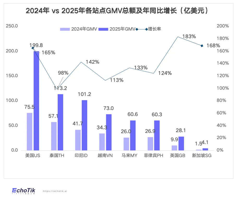 美国以近200亿美元贡献核心份额,发挥增长基石作用;东南亚作为增长引擎表现突出,泰国、印尼双双突破百亿,越南、马来西亚、菲律宾均超60亿美元,构成高增长第二梯队;欧洲市场上,英国以超28亿美元GMV和183%的同比增速,成为增长黑马。