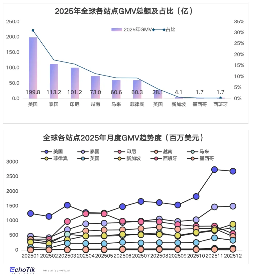 据EchoTik数据,2025年TikTok Shop全球GMV突破653亿美元,同比增长约150%。其中美国贡献近200亿美元(占比23%),泰国约110亿美元(13%),印尼约102亿美元(12%),分列前三。