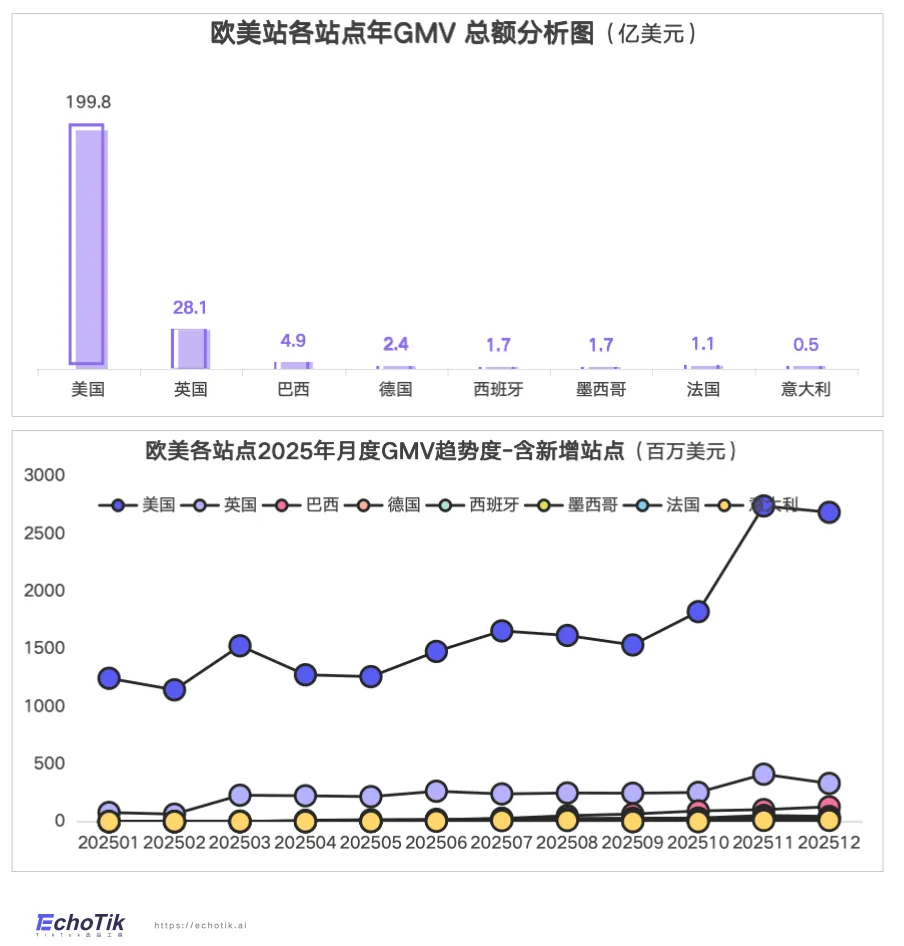 美国作为绝对核心,全年GMV达199.8亿美元,同比增长129%。年末旺季爆发力强劲,11月单月冲高至27.4亿美元。英国作为欧洲成熟站点,全年GMV达28.1亿美元,同比激增183%,月度走势稳健,11月峰值达4.1亿美元,验证了社交电商模式在欧洲的成功。