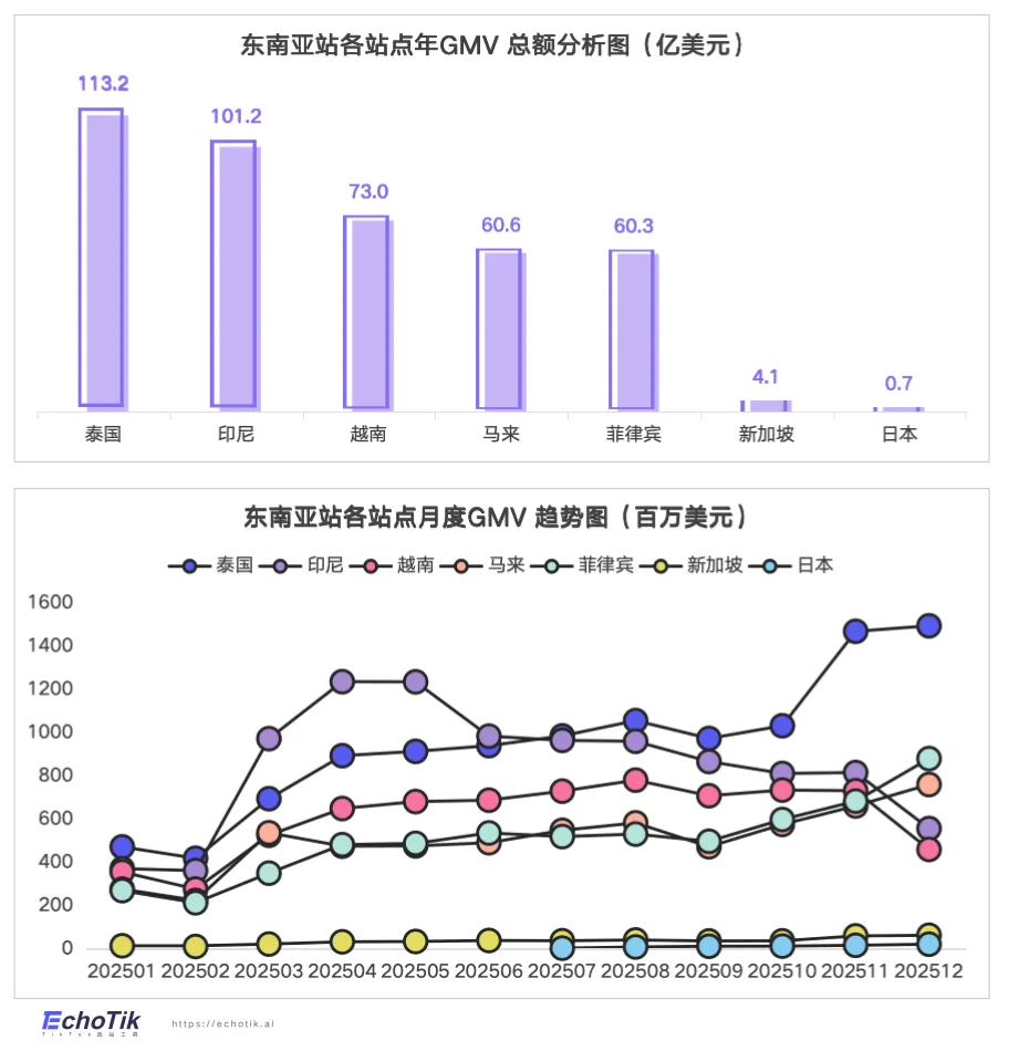从月度走势看,市场呈现“双引擎驱动,节点分化”的节奏。泰国、印尼、马来西亚受新年促销驱动,月度峰值突破十亿美元;斋月过后各站点热度普遍回落,但泰国在年底促销季中重拾强劲上升趋势。