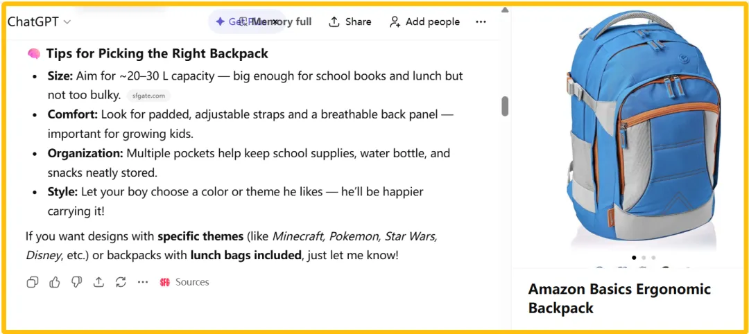 年龄/尺寸适配:优先筛选“明确适配目标人群”的产品,比如“8-12岁适用”,而非模糊的“儿童书包”; 核心使用场景:必须清晰定位用途,比如“校园专用”“运动+通勤”,拒绝“万能通用”的模糊定位; 质量信号:品牌口碑、耐用性相关描述(比如“防水面料”“加固缝线”)会加分; 具体型号名称:AI偏爱能“直接引用”的具体型号(比如“AeroPack Youth 24L”),而非“大容量儿童书包”这种 generic 名称; 低认知风险:优先推荐“安全选择”,比如参数清晰、定位明确的产品,避免模糊不清的小众款; 结构化信息:Listing标题、卖点、图片越规整,AI越容易理解和引用; 真实用户反馈: reviews 里频繁提及“适配10岁孩子”“校园用刚好”的产品,会被AI判定为“更符合需求”; 清晰约束条件:明确说明“不适合谁”(比如“不适合15岁以上青少年”),反而会提升AI的信任度。