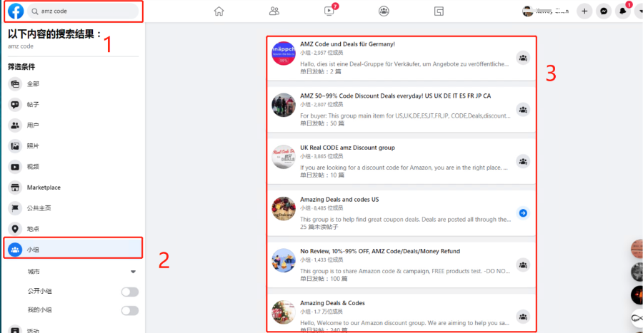 1)搜索关键词deal、coupon等关键词+站点,可以获得大量的群组,虽然这部分有很多都是被用烂的了。注意着是不需要点选“小组”选项的,直接在“全部”里面查看模糊匹配的结果即可(模糊搜索)