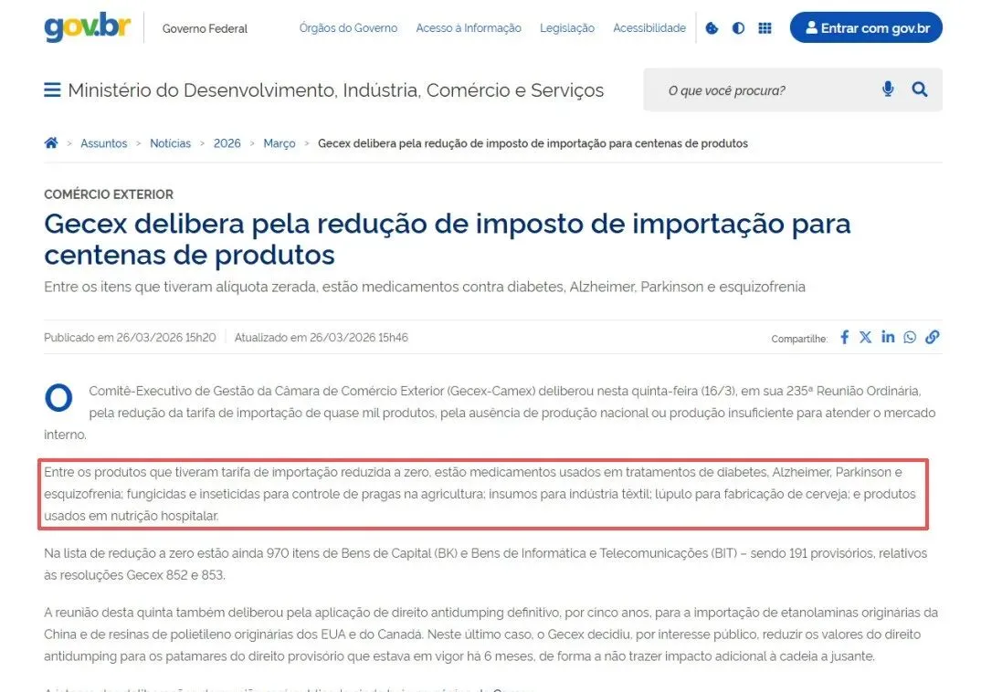 此次共涉及970种产品实行零关税。据巴西发展、工业、贸易和服务部(MDIC)说明,其中779种商品此前已享有优惠关税待遇,本次为常规延期。