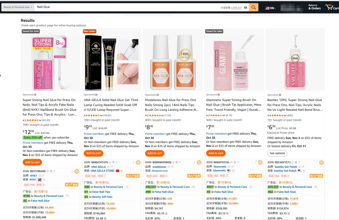 用产品核心词(比如 “nail glue”)在亚马逊前台搜索,从结果页看产品主图、类目,找到和自己 “长得一样” 的同款;