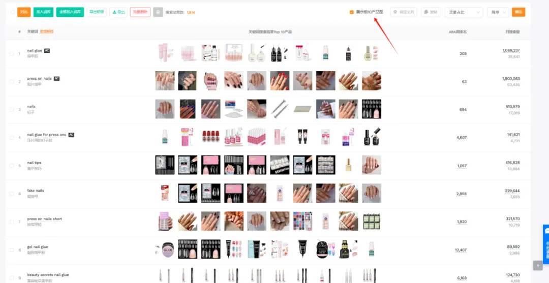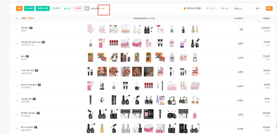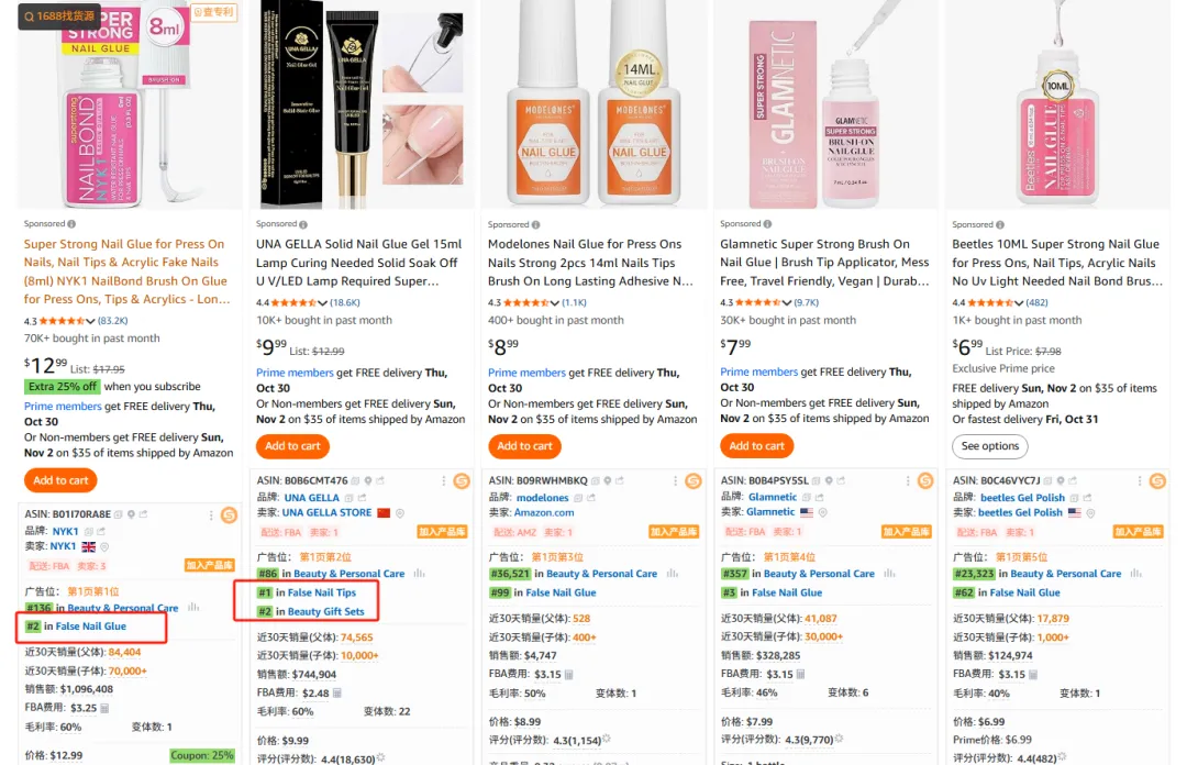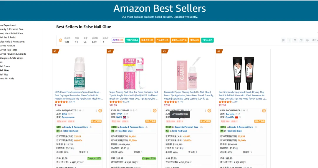 跳转到类目 BSR 榜单(比如 “False Nail Glue” 榜单),筛选 Top100 里的同款 / 相似款,一键复制 10 个以上 ASIN(越多数据越全)。
