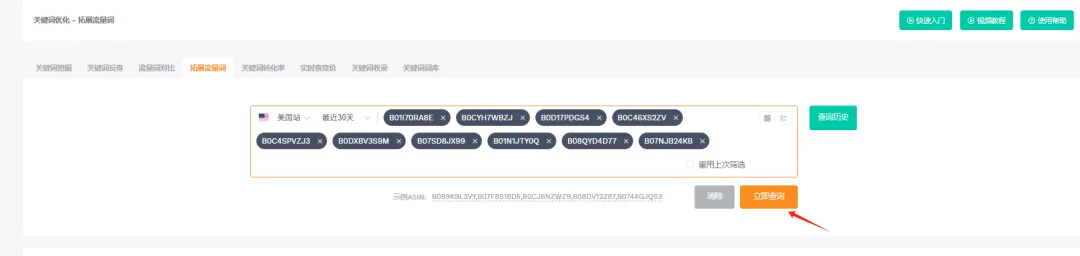 把收集到的 ASIN 导入卖家精灵【拓展流量词】功能,一键反查 —— 这里能拿到近 30 天进入亚马逊搜索结果前 3 页的所有流量词,还支持合并去重。